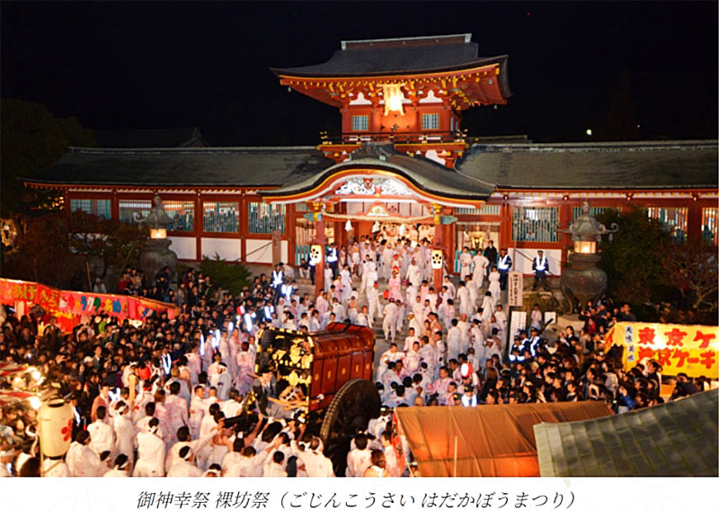 この天満宮の四季折々の行事は楽しみで、一番有名なお祭りは秋の終りに行われる「御神幸祭(ごじんこうさい)裸坊祭(はだかぼうまつり」(通称裸坊)で大変賑わいます。